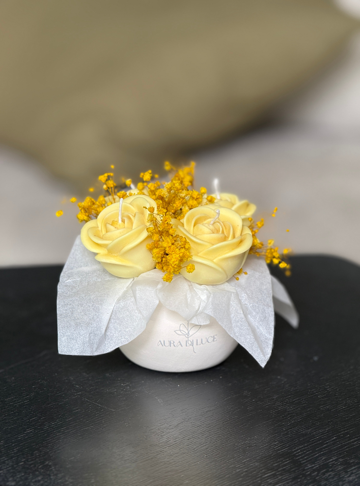 El amarillo no es solo un color; es una emoción. En el lenguaje de las flores, las rosas amarillas simbolizan la amistad incondicional, la alegría y los nuevos comienzos. Hemos esculpido cada pétalo a mano en cera de soya para lograr un tono “mantequilla” y dorado que es elegante, no estridente.